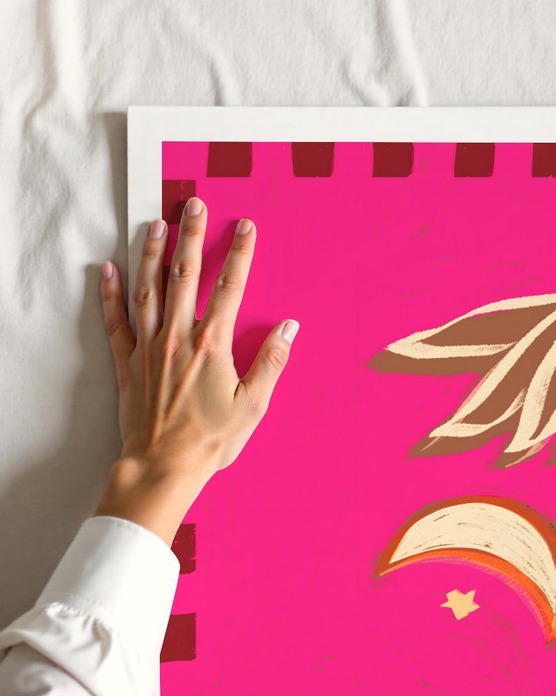 Infused with cosmic energy and symbolic beauty, Celestial Exchange is a striking canvas print that speaks to connection, mystery, and the quiet power of giving and receiving. Against a vivid magenta backdrop, two hands gently pass crescent moons and stars between them—a poetic visual of unity and the universe shared. The bold color palette and simplified form create a modern, almost mystical aesthetic perfect for statement walls. Whether you're curating a bold boho gallery or looking to elevate a modern, eclectic interior, this artwork is a vibrant focal point that blends emotion, symbolism, and style in one radiant piece.