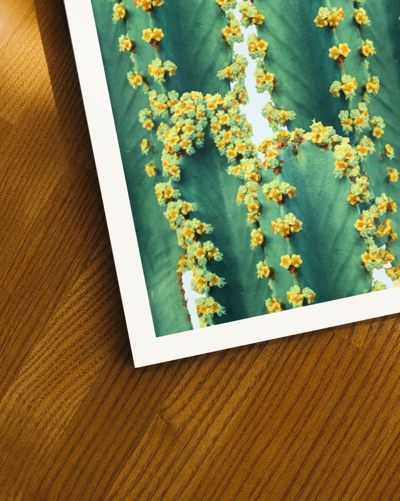 Featuring lush green cacti adorned with delicate yellow blooms, this artwork captures the beauty of nature in a modern, minimalist style. The soft blue background enhances the fresh, sunny vibe, making it a perfect addition to any room or design in need of a pop of color, warmth and a touch of desert charm.