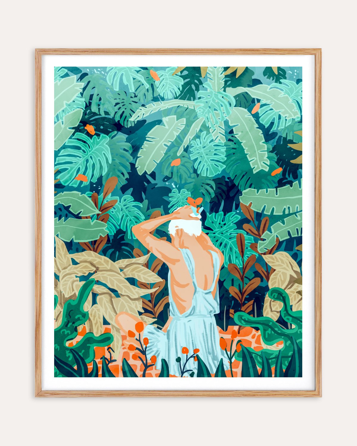 Escape to a lush oasis and immerse yourself in the tranquility of a hidden jungle garden with this captivating piece. This artwork depicts a serene moment of solitude, featuring a figure bathed in soft light, nestled amidst a vibrant tapestry of tropical foliage. The cool blues, lush greens, and pops of warm orange creates a visually soothing yet dynamic composition.