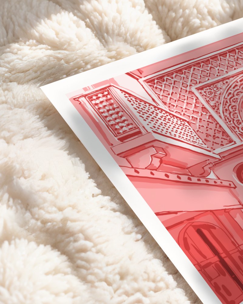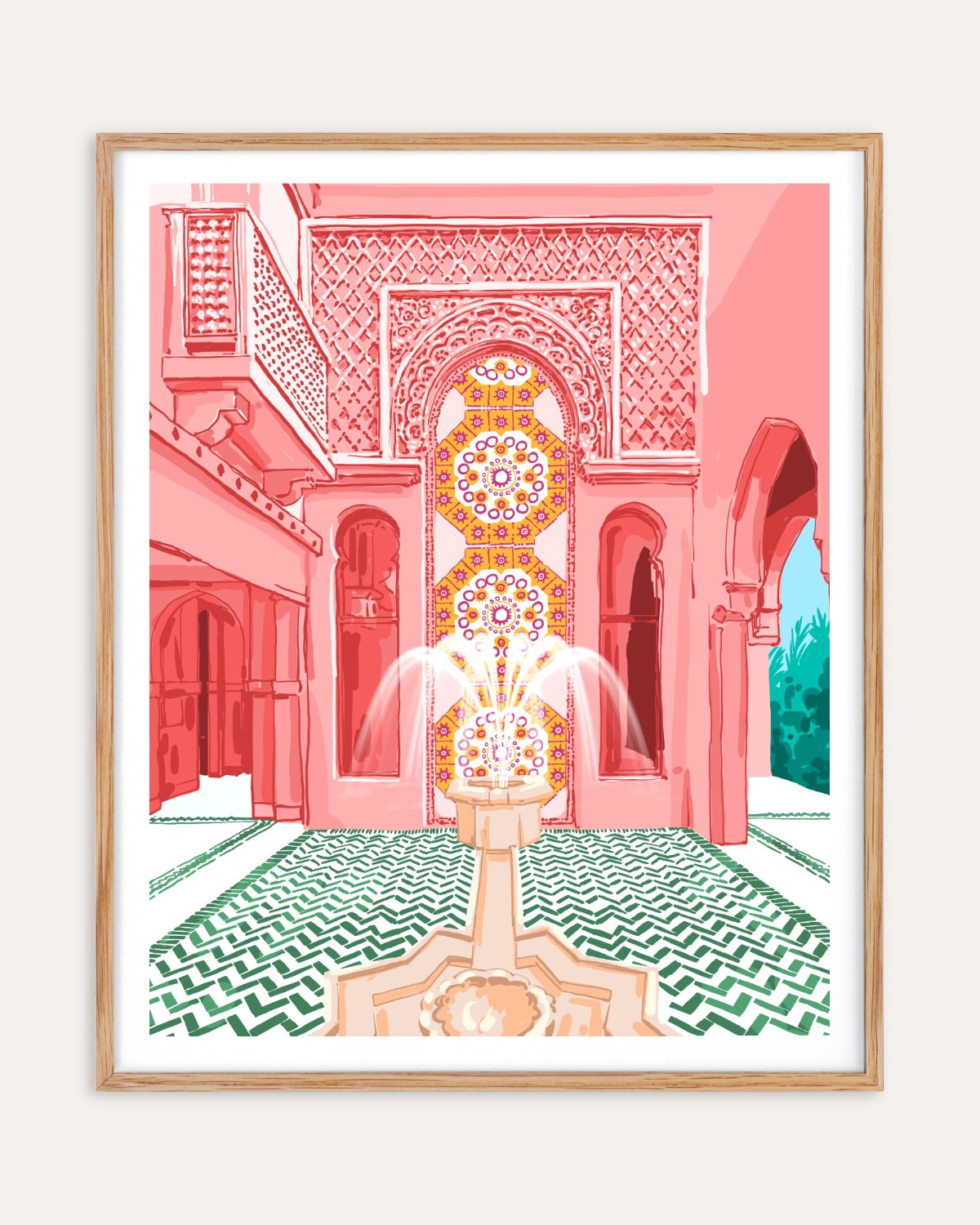 Step into a world of opulent color and tranquil charm with The Blush Palace — a vibrant art print inspired by the timeless elegance of Moorish architecture. Featuring arched doorways, intricate tile work, and a serene central fountain, this piece evokes the feeling of wandering through a rose-hued courtyard on a sun-drenched afternoon. The blend of saturated pinks, ornamental golden patterns, and lush green accents makes it a standout piece for eclectic homes, travel-lovers, or anyone drawn to global aesthetics. Whether styled in a modern space or bohemian nook, this artwork brings a touch of wanderlust and architectural beauty to any room.