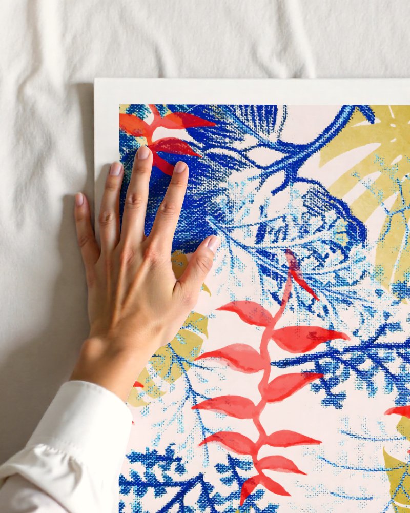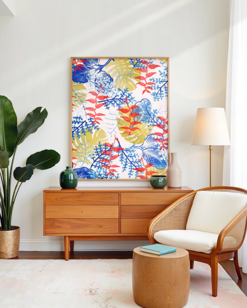Perfect for brightening living rooms, bedrooms, creative studios, or any space that needs a touch of tropical vibrance, this piece instantly lifts the mood with its playful composition and fresh, contemporary palette. Printed with museum-grade quality and crisp detail, Budding Romance adds a stunning pop of color and personality to your walls — an effortless way to infuse your home with warmth, creativity, and that signature 83 Oranges charm.