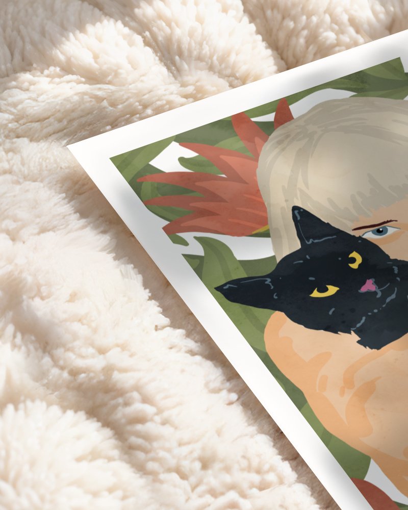 Bold, tropical, and fiercely tender — Cat Lady is a celebration of soulful connection and quiet strength. This vibrant canvas print captures a platinum-haired woman gently embracing a sleek black cat, set against a lush backdrop of wild green leaves and warm botanical blooms. Every brushstroke radiates independence, love, and that unapologetic 83 Oranges energy. Printed on premium-quality canvas with rich, archival inks, this piece adds a splash of wild femininity to any space — perfect for eclectic interiors, art lovers, or proud cat moms everywhere.