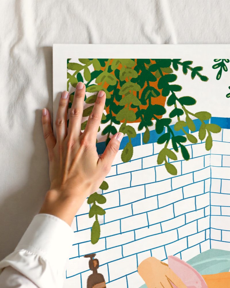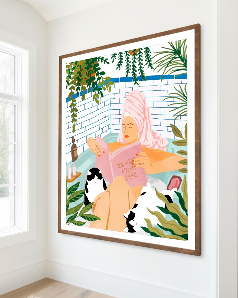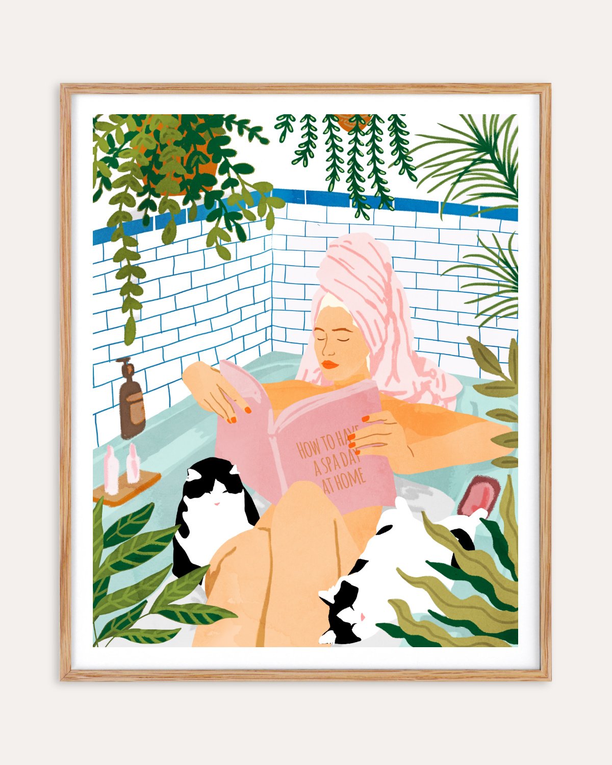 This print is a celebration of self-love and indulgence for anyone who appreciates the art of unwinding. Featuring a tranquil serene retreat of self-care, the artwork depicts a woman relaxing in a lush, plant-filled bath, wrapped in a pink towel on her head, spending quality time with her cats and engrossed in a book and learning how to have a spa day at home. The soothing tones of green, blue, and blush pink create a calming atmosphere, while the playful details—like the hanging greenery and cozy bath essentials—add charm and personality.