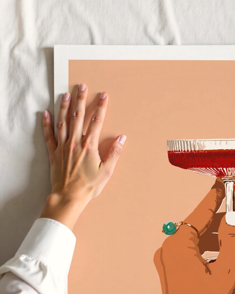 Say Hello to this chic and modern artwork, featuring a minimalist illustration of a hand elegantly holding a coupe glass filled with wine. The warm peach background adds a touch of sophistication, while the bold details, like the emerald ring and perfectly manicured nails, exude effortless style and luxury. This print is a celebration of refined taste and contemporary design. Cheers to timeless elegance!