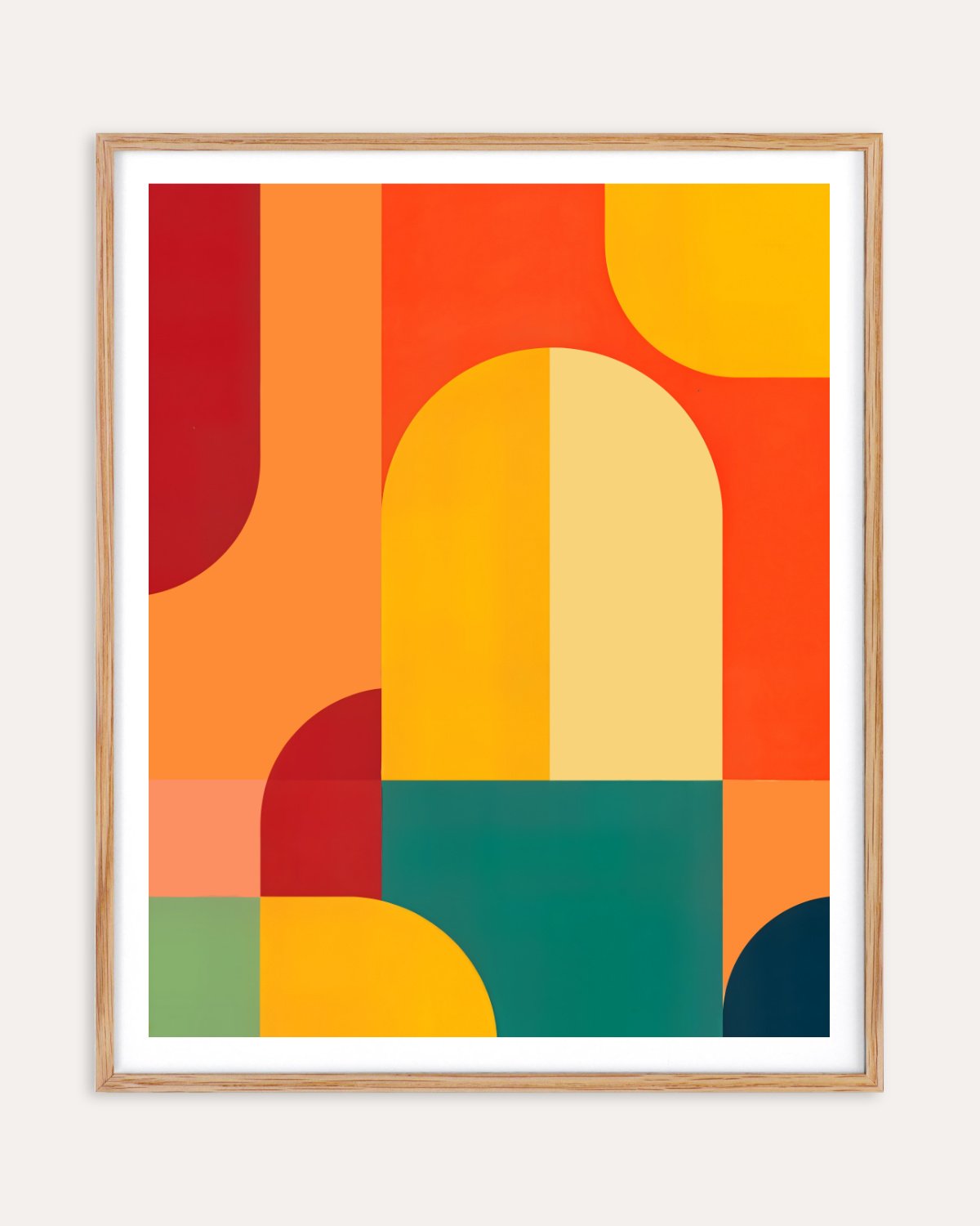 Geometry with a sun-soaked soul. A bold interplay of arches, curves, and blocks, Color Archs celebrates the joy of structure through warm hues of tangerine, marigold, terracotta, and emerald. The composition feels like a modern-day mosaic—structured yet playful, retro yet timeless. Perfect for those who love color, symmetry, and a dash of architectural charm.