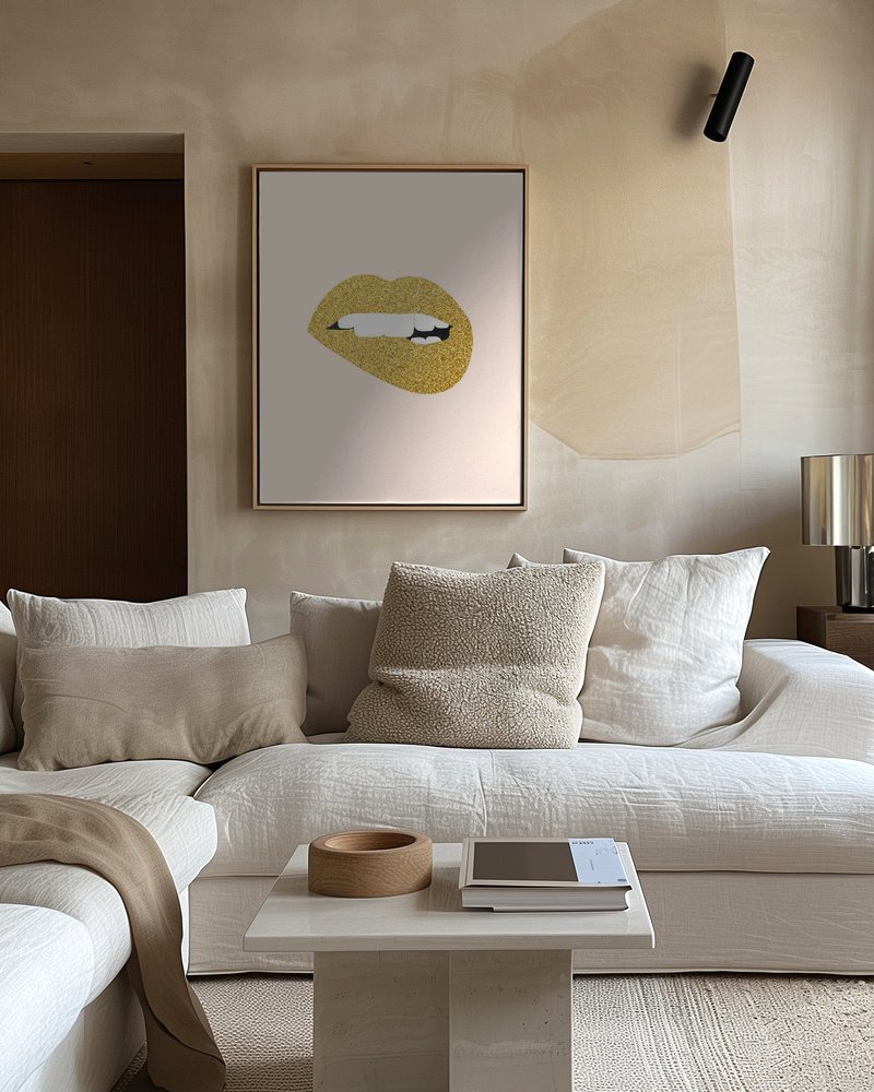 Set against a soft, blush pink background, the shimmering gold lips instantly command attention and bring along some playful glamour. The contrast between the opulent texture and the delicate background creates a visually captivating and modern aesthetic. This piece exudes confidence, a hint of sass, and undeniable chic. It's a fun and stylish piece that's sure to spark conversation and add a touch of sparkle to your everyday and creative projects.