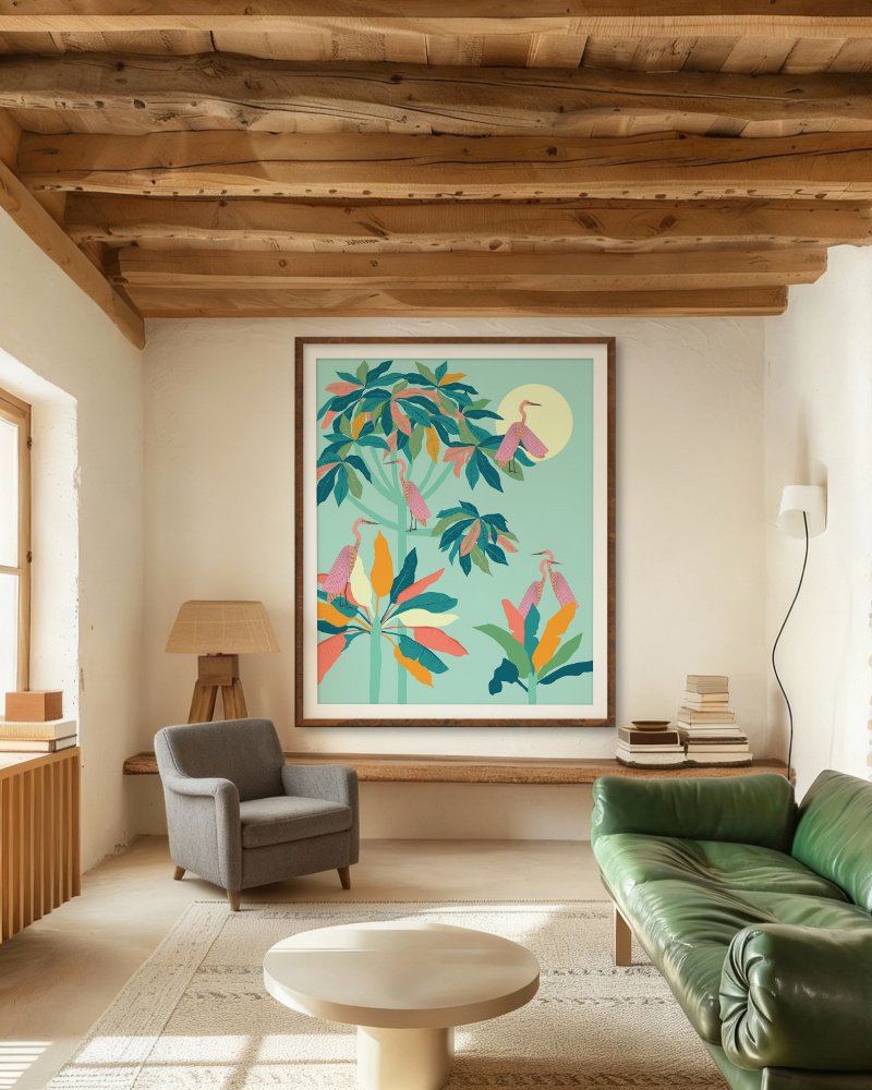 Perfect for brightening living rooms, bedrooms, nurseries, or creative spaces, this piece adds a refreshing sense of escape — like a window into a soothing island paradise. Its modern palette and clean, minimal framing make it an effortless statement piece for any contemporary or boho-inspired interior. A beautiful reminder to slow down, look up, and find wonder in the quiet moments of nature.