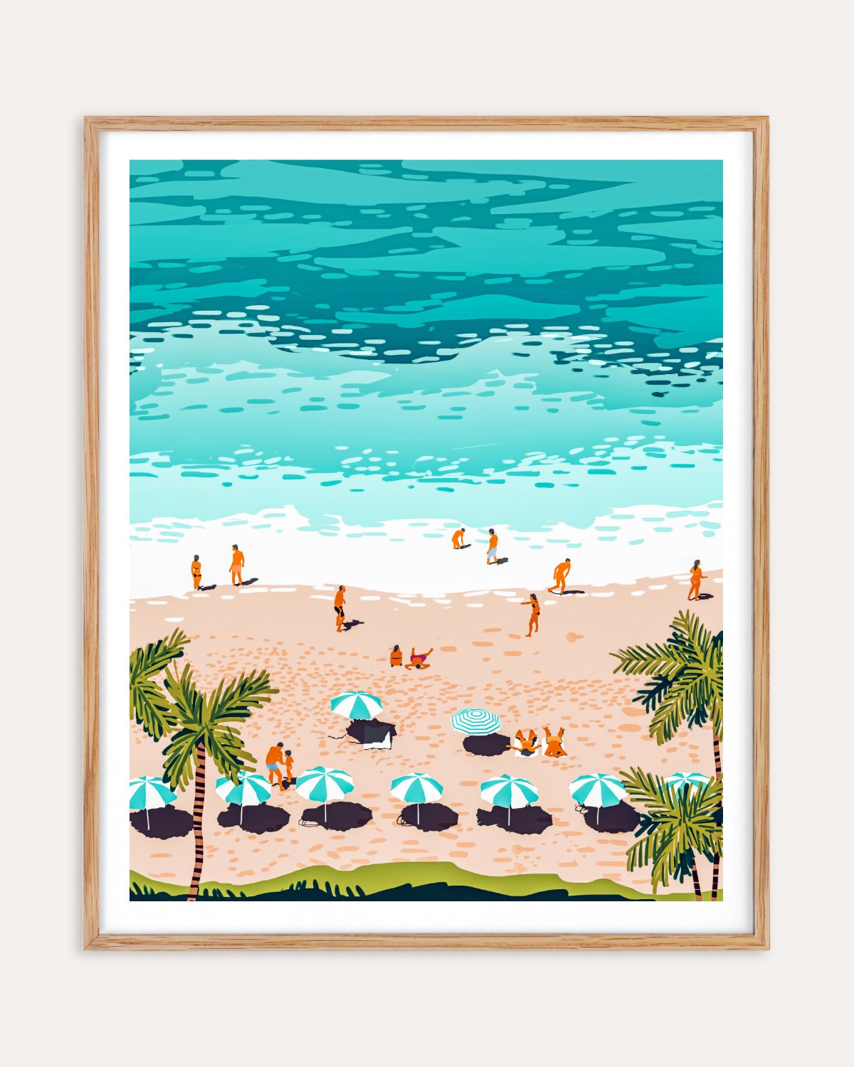 Soak in the laid-back charm of a perfect beach day. We Dream in Colors Borrowed from the Sea captures a sun-drenched shoreline where turquoise waves meet a sandy coast dotted with teal-striped umbrellas, swaying palms, and beachgoers basking in the moment. This artwork blends tropical nostalgia with a playful, modern aesthetic—ideal for brightening up any space or project with warmth, movement, and the carefree spirit of summer.