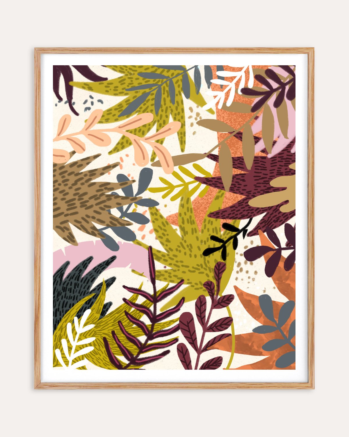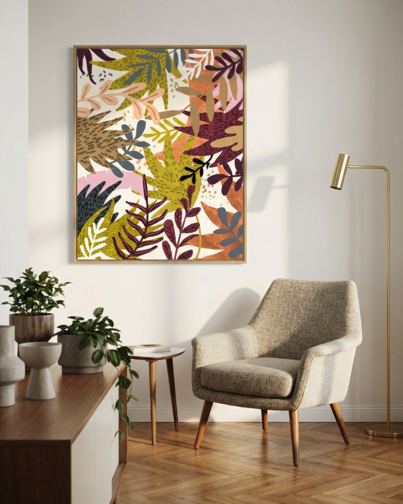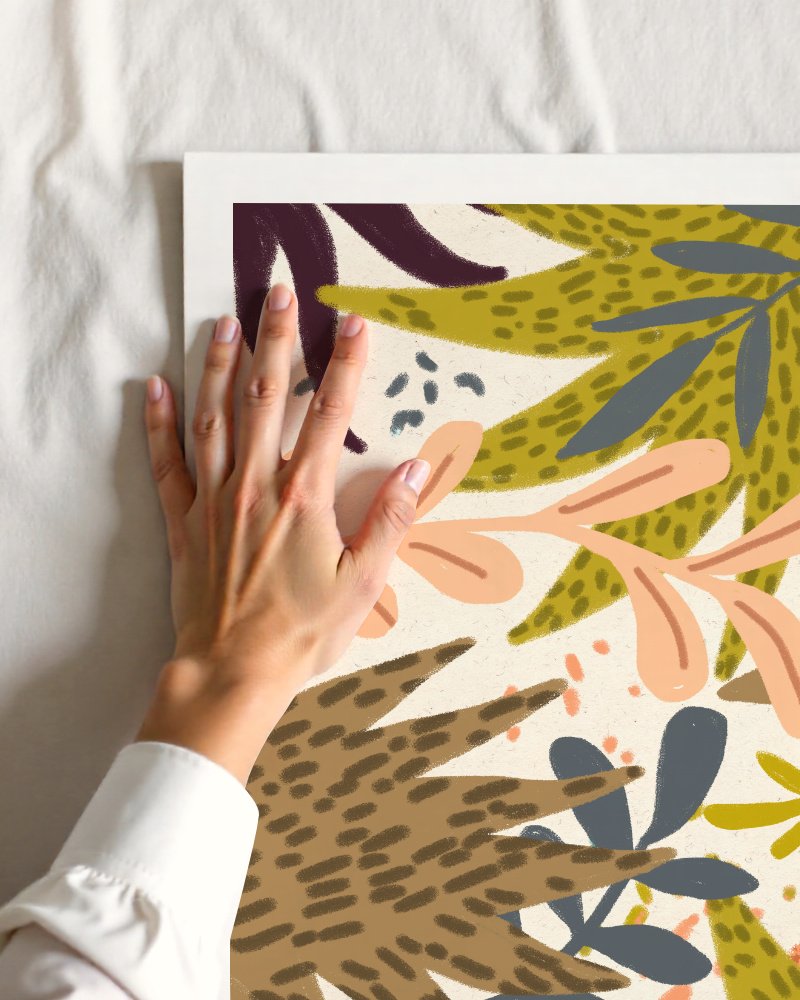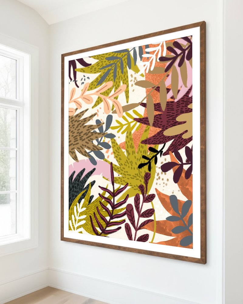 This piece is an exploration of the balance between organic chaos and intentional pattern. By layering stylized botanical forms, I aim to capture the “organized mess” of the wild—where growth feels both spontaneous and perfectly placed. The choice of a grounding palette—featuring terracotta, mustard, and deep plum—is intended to evoke a sense of warmth and permanence.