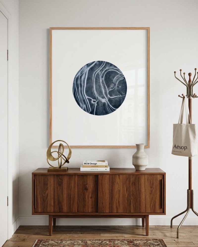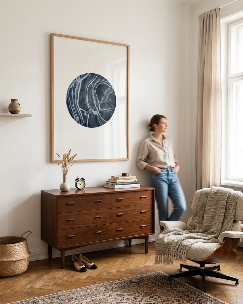 Made to live with you — not just hang on your wall. For spaces that want to feel alive, not just styled.Minimal, modern, and quietly mesmerizing — this artwork invites you into a world carved by nature’s own hand. A single circular form floats on crisp white space, revealing intricate marbled lines that resemble frozen rivers, lunar landscapes, or the delicate pathways of memory. Its cool charcoal and ivory tones create a soothing, balanced presence that instantly elevates any room.