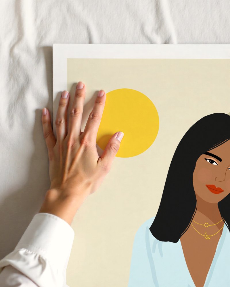 Except You, All That I Need Is Right Here With Me, a modern art piece that radiates calm independence and serene luxury. Featuring a poised woman in a flowing sky-blue outfit, framed by golden sunlight, lush greenery, and a wild feline companion, this artwork celebrates feminine energy and the peace of being grounded in your own space. A harmonious blend of minimalism and vibrance, this print is perfect for bedrooms, creative studios, or cozy corners where you want to infuse warmth, self-love, and style.