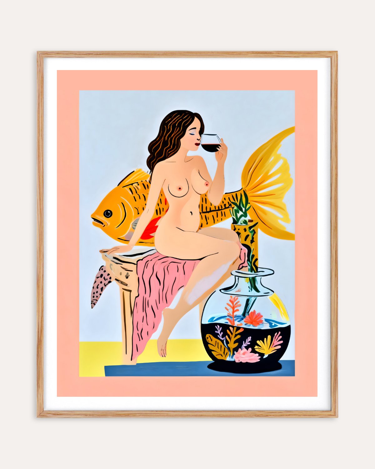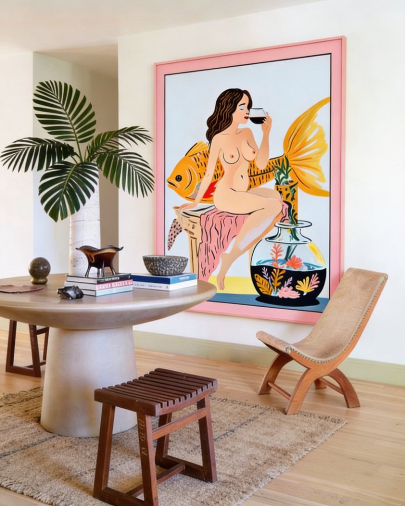A surreal celebration of solitude, sensuality, and strange company. This playful yet elegant artwork features a confident nude woman sipping wine beside an oversized golden fish, merging fantasy and everyday indulgence. Set against dreamy pastel tones and grounded by a whimsical aquarium, it blurs the lines between myth, metaphor, and modern life. Perfect for collectors who crave bold, cheeky storytelling with a twist of fine-art flair.