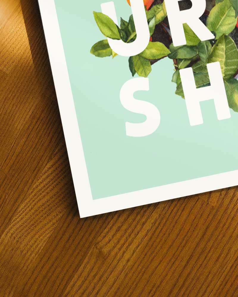 Featuring a lush arrangement of green leaves and ripe oranges set against a refreshing mint background, this piece radiates positivity and growth. The bold, modern typography overlays the natural elements, creating a striking balance between nature and design. Perfect for any space or design in need of a motivational boost, this print is a reminder to thrive and embrace life's beauty.