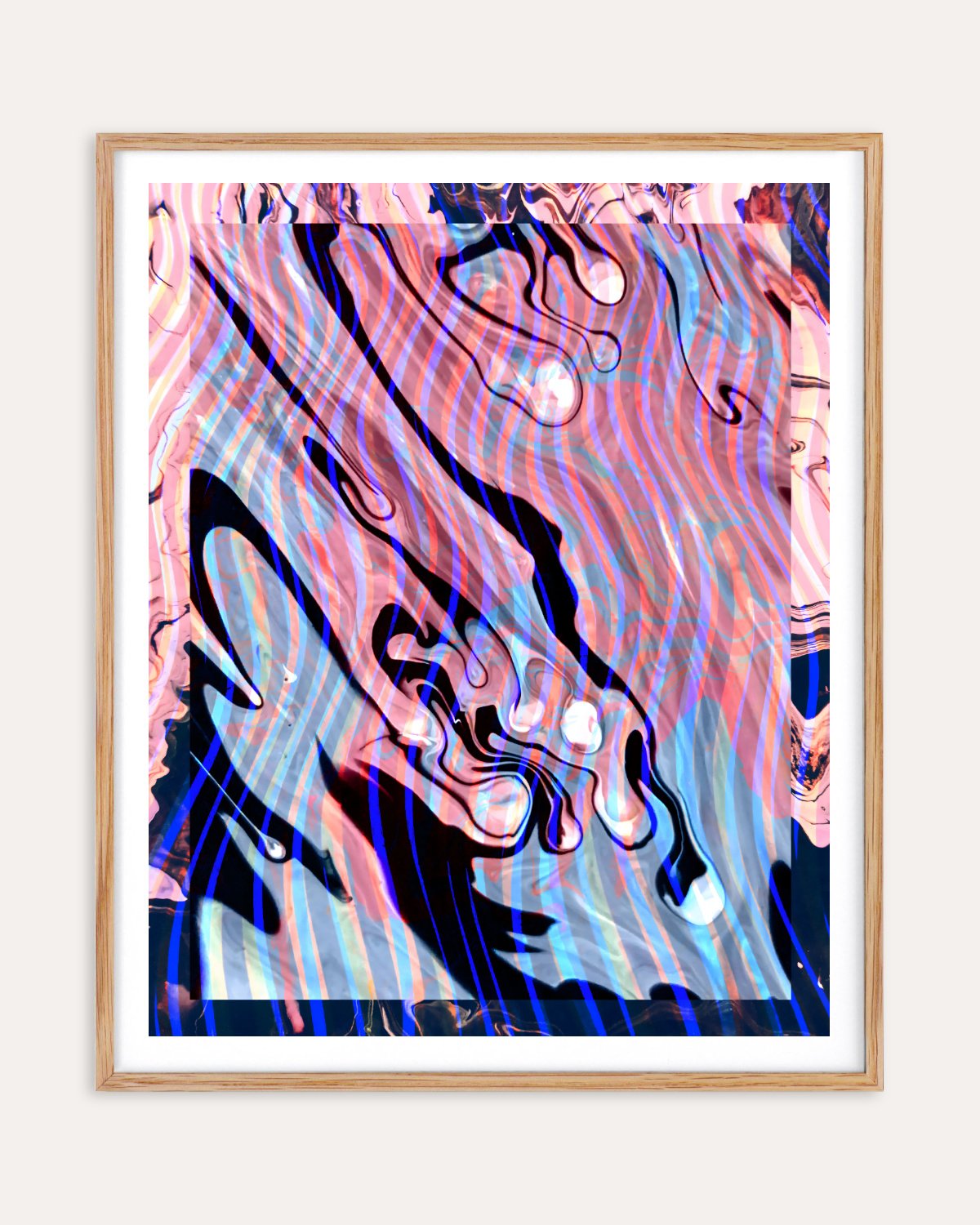 This piece is a celebration of maximalism, where each layer of marble creates a dynamic interplay of hues, inviting viewers to explore its depth and complexity. The rich pinks evoke a sense of warmth and energy, while the striking blues add a refreshing contrast, making this artwork a perfect focal point that embodies both elegance and exuberance.