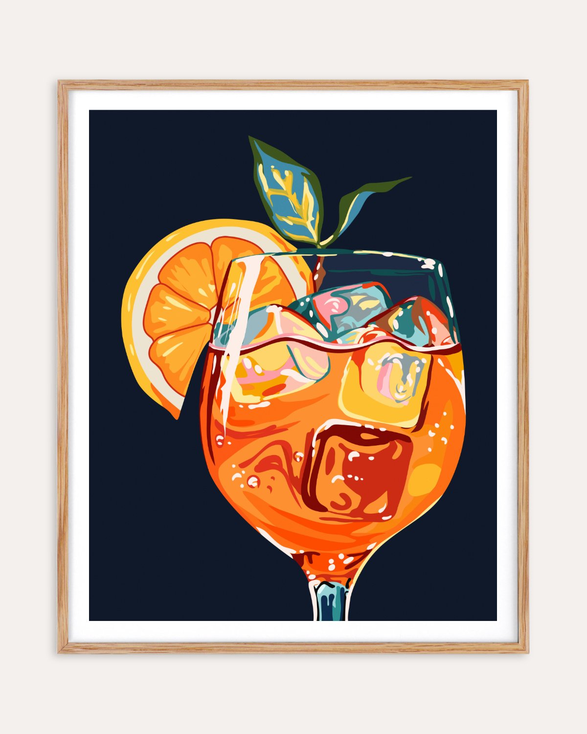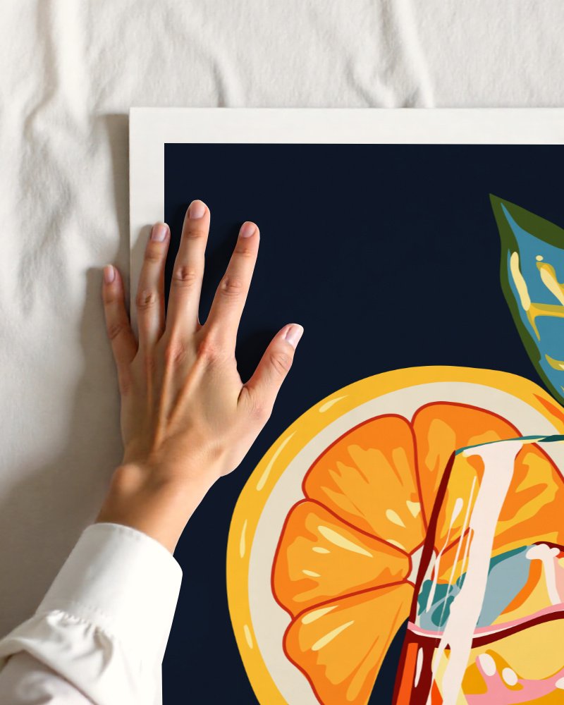 Raise a glass to good vibes with Hawaiian Cocktail, a bold and refreshing art print that captures the essence of tropical leisure. This vibrant illustration features a dazzling orange cocktail brimming with ice, citrus slices, and a sprig of lush greenery—set against a deep, dramatic background that makes every color pop. Perfect for kitchens, bars, dining nooks, or anywhere that deserves a splash of summer energy. Whether you’re dreaming of island escapes or hosting happy hour at home, this piece brings the party to your walls.