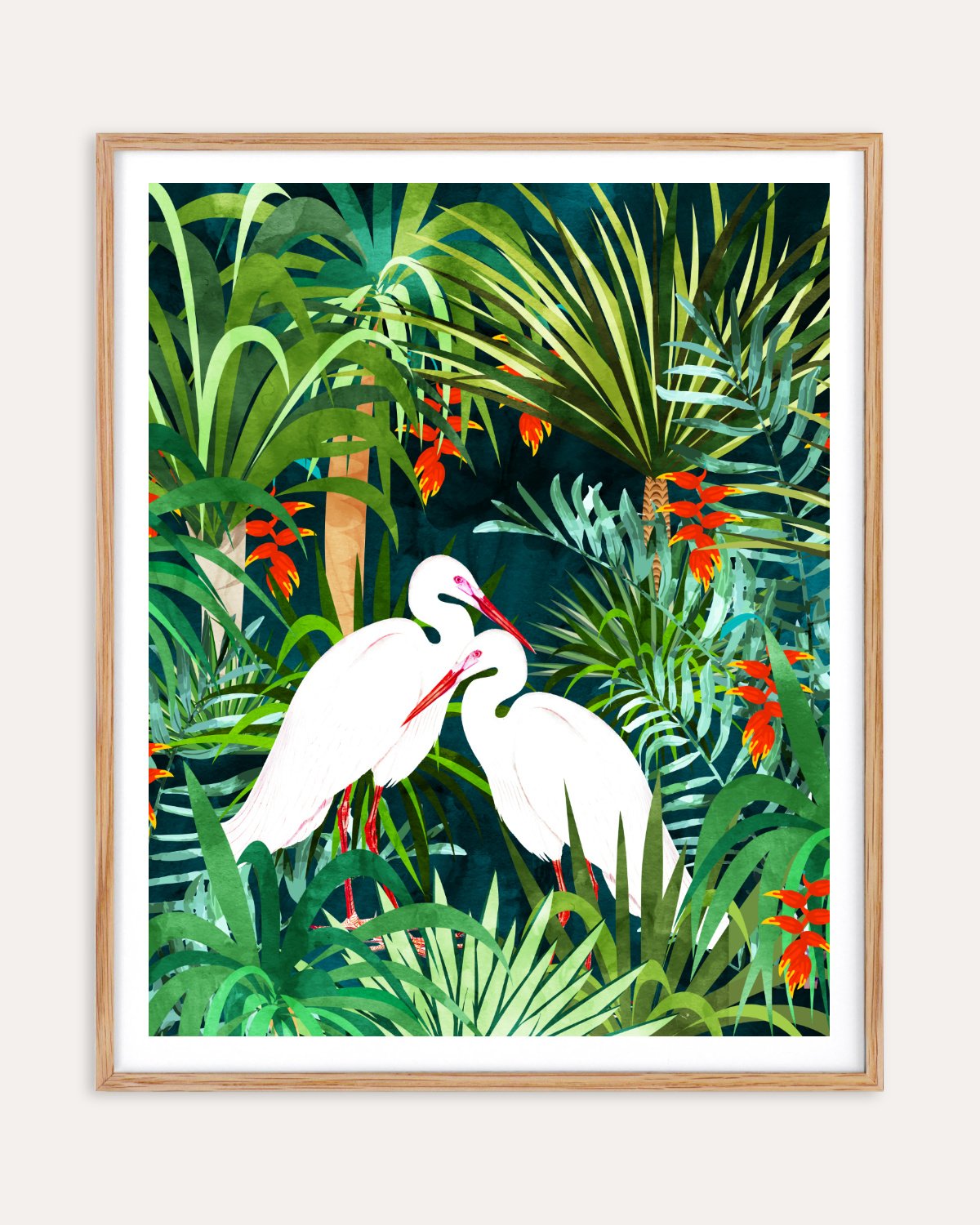 Embrace nature with this vibrant and captivating artwork, featuring two elegant white egrets nestled amidst lush tropical foliage. The rich green tones of the jungle, accented by pops of fiery orange flowers, create a striking contrast that brings the scene to life. This piece is a timeless celebration of nature's elegance.
