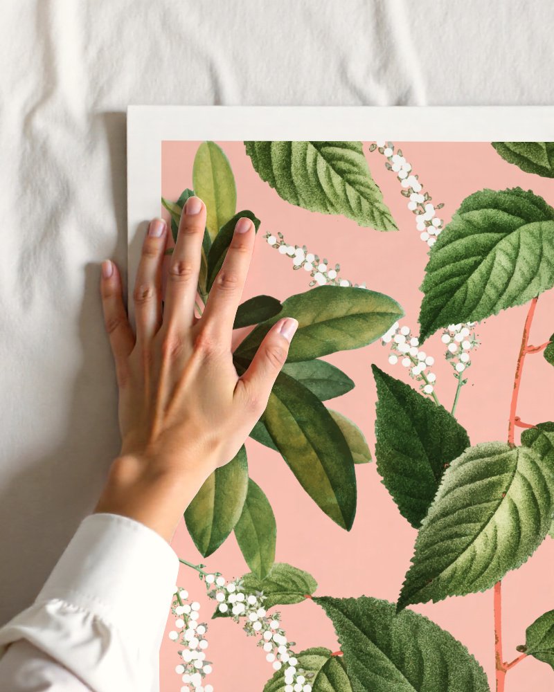 This elegant botanical art print features lush green leaves and delicate white blossoms layered against a soft blush-pink background. Inspired by the quiet beauty of nature in motion, the artwork balances freshness and calm with a contemporary decorative appeal. The detailed foliage and soothing color palette make it perfect for botanical art lovers, modern nature décor, and serene interior styling. Ideal for living rooms, bedrooms, dining spaces, or home offices, this floral print adds warmth, sophistication, and a gentle sense of growth to modern, boho, and Scandinavian interiors.