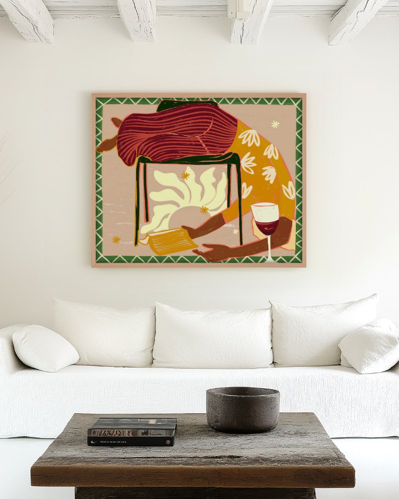 This unique illustration celebrates the sweet release of downtime – The art of unwinding. It features a figure draped over a stool in a moment of utter exhaustion or deep relaxation, reaching for a book while a glass of red wine awaits. The mood is set by a warm, sophisticated palette of burnt reds, rich ochre yellows, and dusty rose beige, beautifully framed by a lively olive-green geometric border. The artwork combines expressive texture with a stylized, folk-art-inspired composition. It’s a whimsical yet deeply felt visual representation of needing a break—a perfect reminder to prioritize rest and self-care in our busy lives.