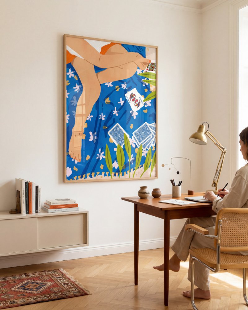 Made to live with you — not just hang on your wall. For spaces that want to feel alive, not just styled.“Joker — Determinism & Free Will” is a vibrant visual meditation on the intersection of fate and agency, capturing the quiet power found in how we choose to play the hand life deals us. Set against a brilliant cerulean floral blanket, the scene centers on a sun-drenched moment of leisure where the presence of the Joker card serves as a playful reminder of life’s beautiful unpredictability.