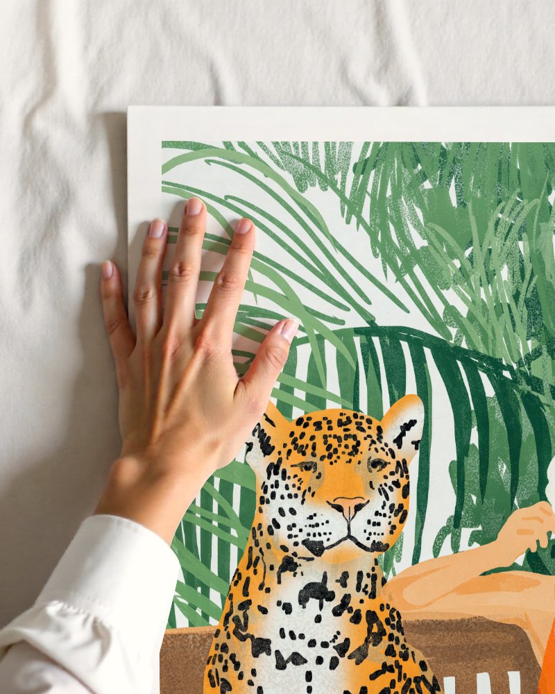 This exquisite artwork capturing the essence of strength and beauty in one mesmerizing image, is one of our best-sellers. The captivating piece features a strong-spirited woman elegantly seated beside a majestic leopard, symbolizing power, courage, and grace. The intricate details and vibrant colors bring this scene to life, showcasing the deep connection between the woman and the wild animal. The woman’s confident expression and the leopard’s piercing gaze create a sense of mutual respect and understanding, making this artwork truly captivating.