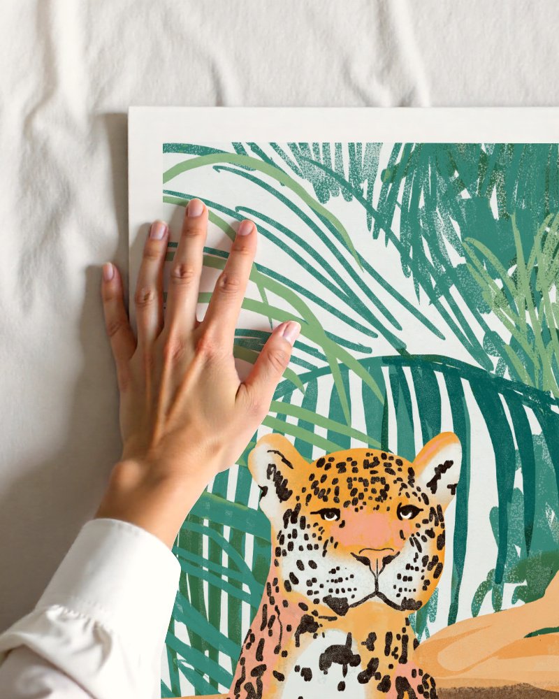 Jungle Vacay” is a visual love letter to the art of slowing down and the untamed beauty of the natural world. This piece explores the profound, silent connection between humanity and the wild, reimagining a tropical paradise as a site of intellectual and soulful repose. By placing a fierce leopard in a moment of domestic tranquility alongside a reading figure, the work invites you to embrace your own “wild at heart” nature while finding sanctuary in the present moment.