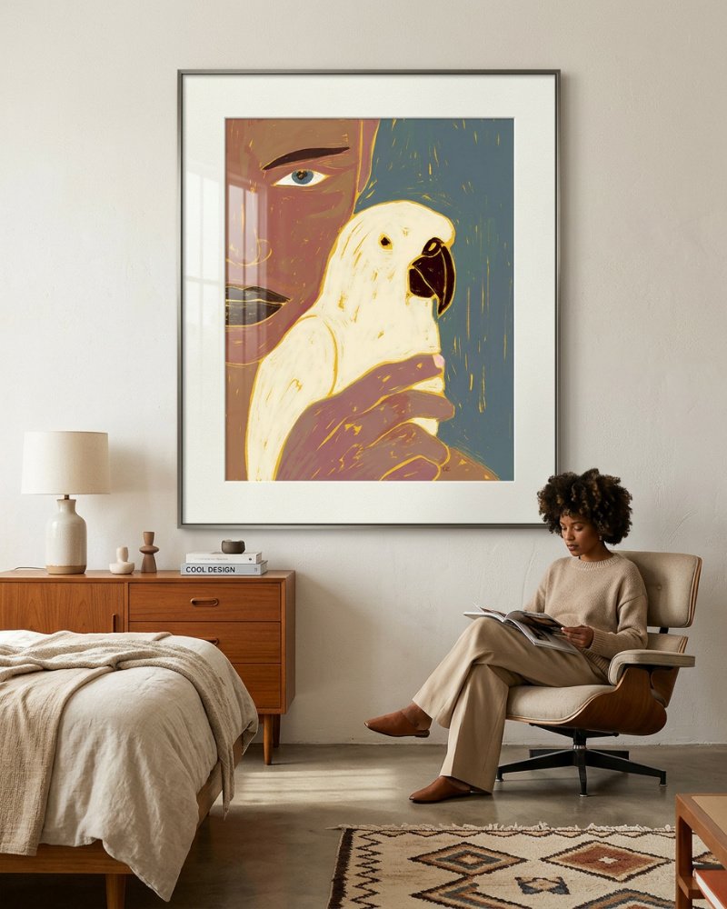 Made to live with you — not just hang on your wall. For spaces that want to feel alive, not just styled.A mysterious and soulful portrait that captures the quiet connection between human and nature. Keeper of Secrets portrays a poised figure holding a white parrot close — a symbol of trust, wisdom, and the unspoken stories that live between kindred spirits. The earthy tones and golden highlights draw you into the painting’s intimate stillness, while the subject’s gaze suggests a world of hidden emotions just beyond reach. This artwork is a celebration of quiet strength, sensitivity, and the beauty found in silent understanding — a perfect statement piece for art lovers who find meaning in mystery.