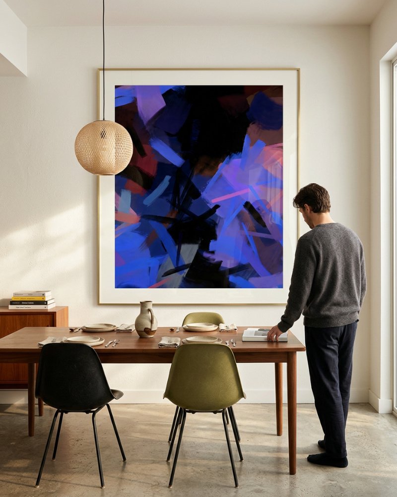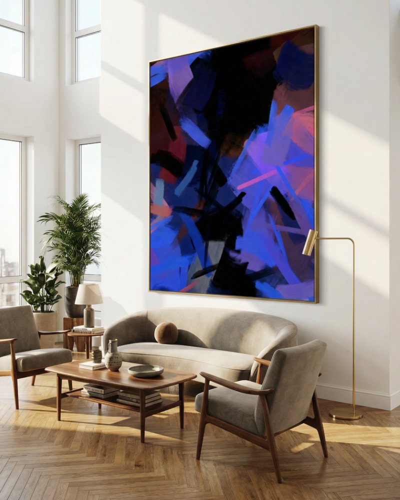 Made to live with you — not just hang on your wall. For spaces that want to feel alive, not just styled.“Midnight Sparks” is an electrifying abstract that captures the quiet intensity of night when inspiration flashes like light against darkness. Deep blues and violets flow across the canvas in bold, expressive strokes, while bright flickers of pink, coral, and electric indigo ignite the composition—like sparks breaking through a midnight sky.