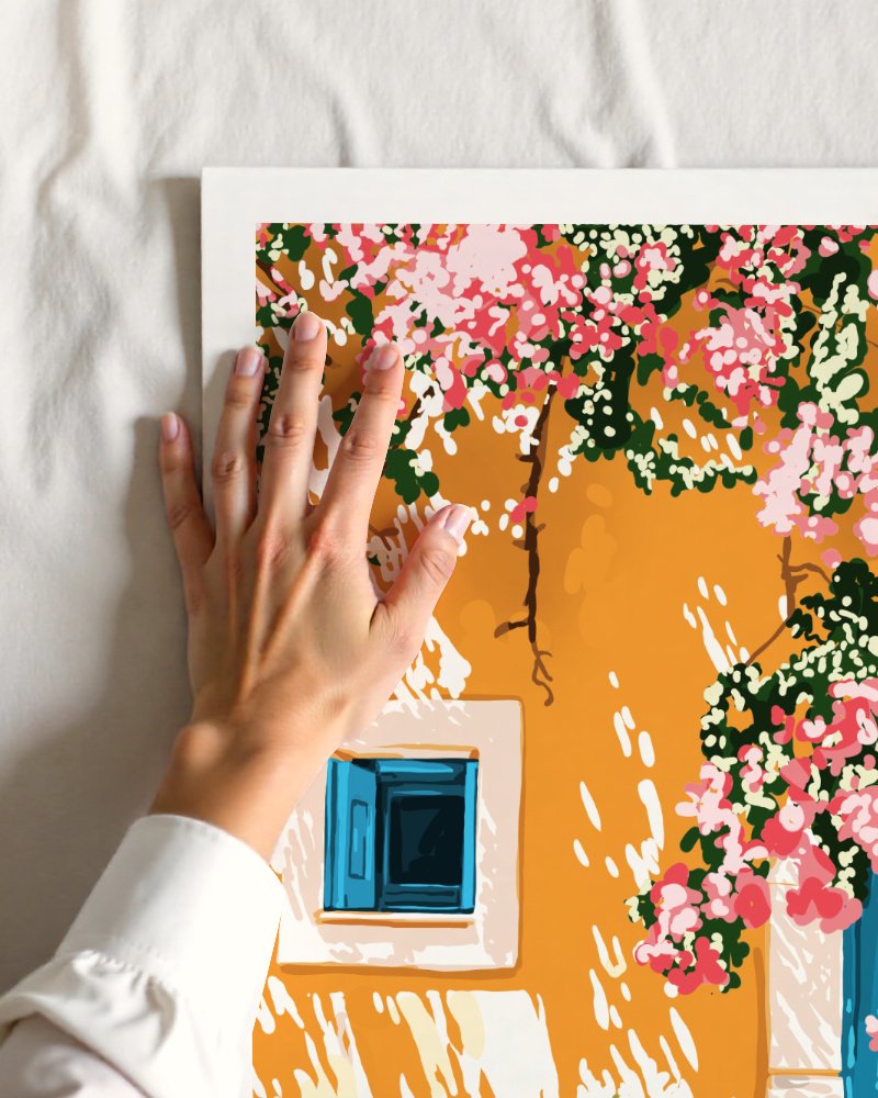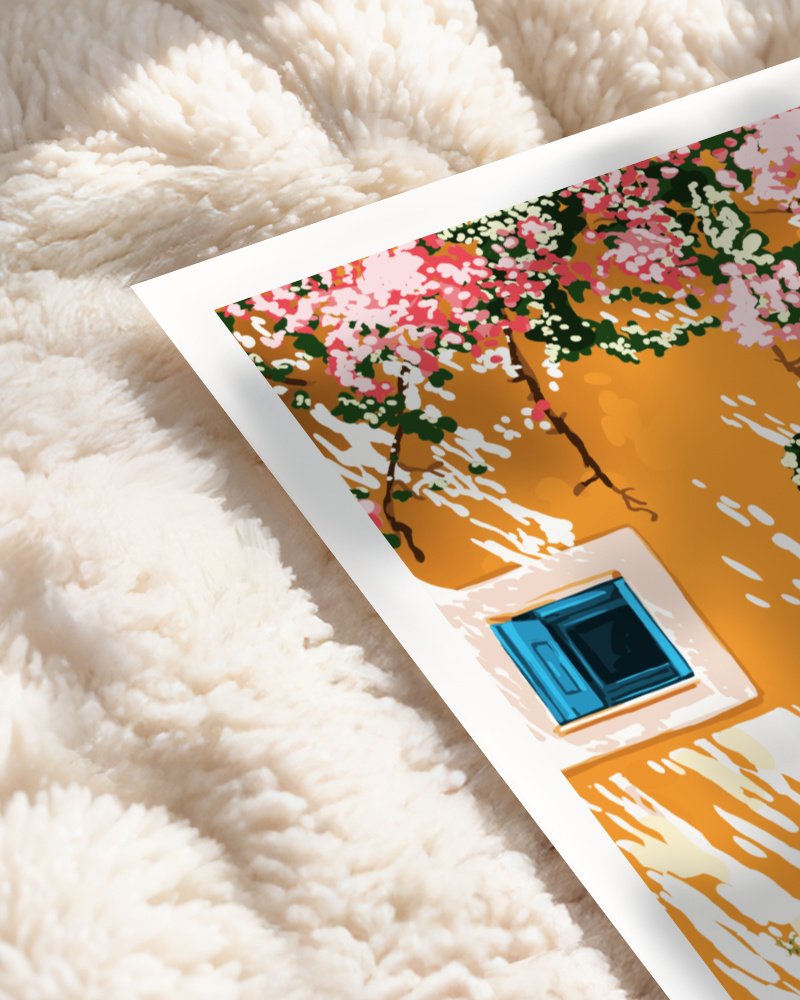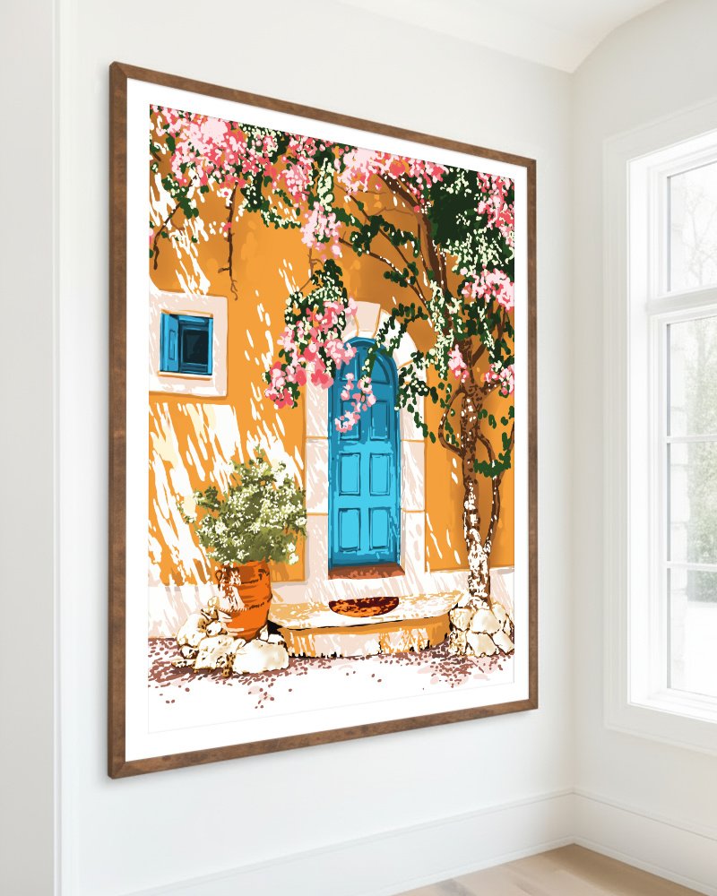 Bring in the charm of Mediterranean beauty with this vibrant artwork. Featuring a picturesque scene of a sunlit golden wall adorned with cascading pink bougainvillea, a striking blue door, and a rustic terracotta planter, this piece radiates warmth and tranquility. The intricate details and bold colors evoke the essence of a serene summer day, perfect for adding a touch of wanderlust to any design. This piece creates a stunning focal point that transports you to a peaceful Mediterranean escape.