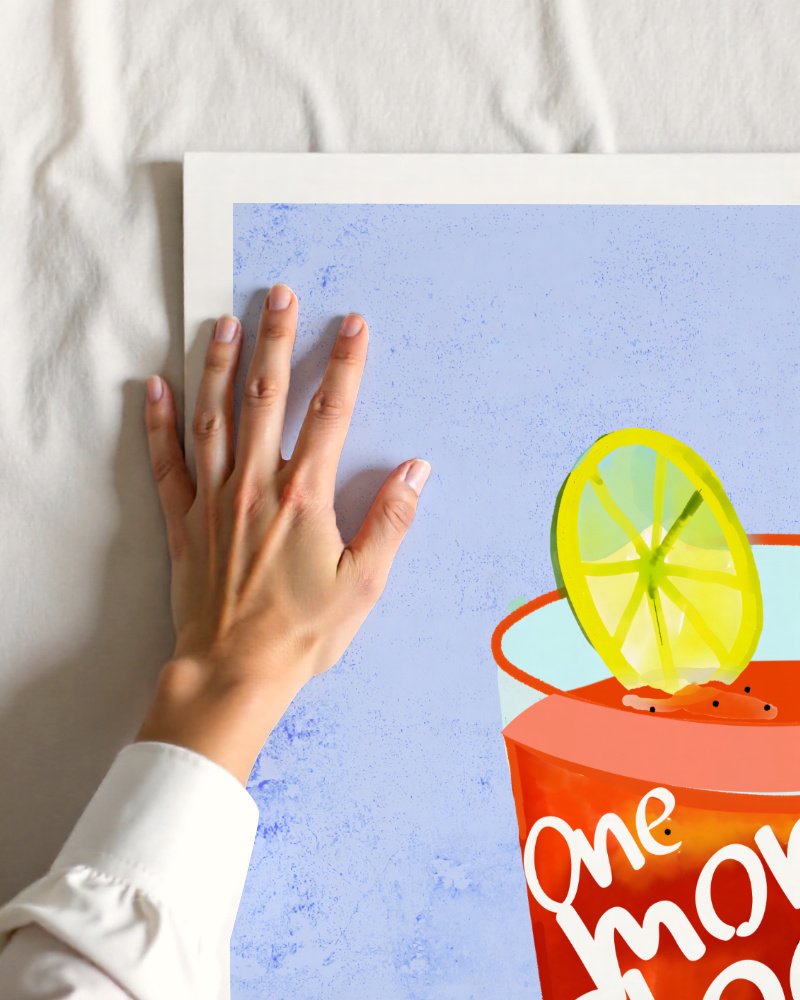 This playful artwork features a bright red Bloody Mary — my favorite cocktail – with a lemon slice, set against a textured blue background. Bold white lettering on the glass reads, “One more Bloody Mary please,” adding a fun, laid-back vibe.