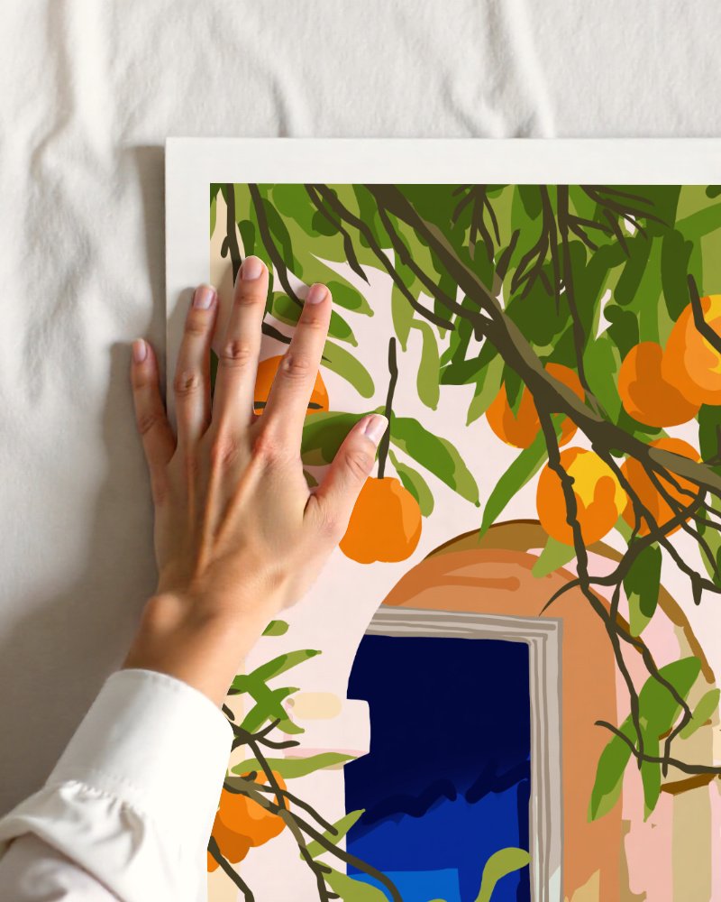 This artwork invites you into a sun-soaked Mediterranean day, where the scent of citrus lingers in the air and the afternoon light paints soft pinks and creams across stucco walls. A cascade of ripe oranges frames the deep cobalt doorway, hinting at cool shade and quiet beyond. Both nostalgic and vibrant, it captures the simple luxury of stepping outside to find abundance quite literally within arm’s reach. Perfect for those who crave a daily dose of warmth, wanderlust, and orchard magic.