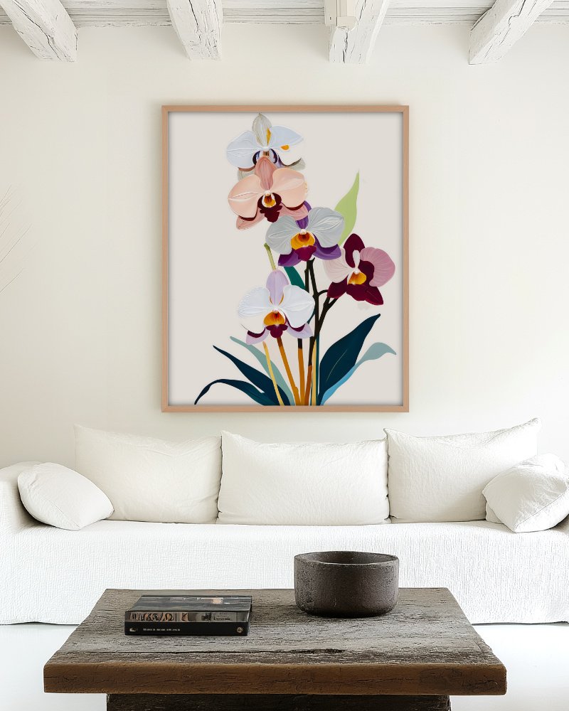 This exquisite piece captures the timeless beauty of orchids, painted with a delicate touch in subdued pastel shades. The gentle hues of pink, lavender, and soft green blend harmoniously, creating a soothing atmosphere. Each petal is meticulously detailed, capturing the intricate patterns and graceful curves of these beloved flowers while the subtle color palette enhances the tranquility of the scene.