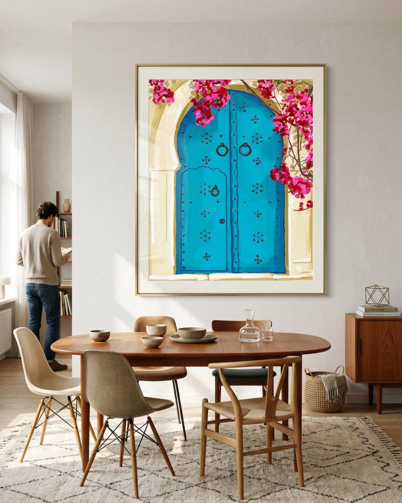 Made to live with you — not just hang on your wall. For spaces that want to feel alive, not just styled.Step into a world where color, culture, and charm collide. “Palace Door” captures the magic of wandering sun-washed streets and stumbling upon a doorway that feels like an invitation into another life. The vivid turquoise door, studded with ornate details, stands boldly against warm sand-toned walls, while cascades of fuchsia bougainvillea soften the scene with a touch of romance. This artwork brings a burst of Mediterranean warmth and wanderlust into any space—perfect for brightening entryways, living rooms, or any corner craving a pop of joyful color. A beautiful reminder that every door holds a story—and some lead straight to paradise.
