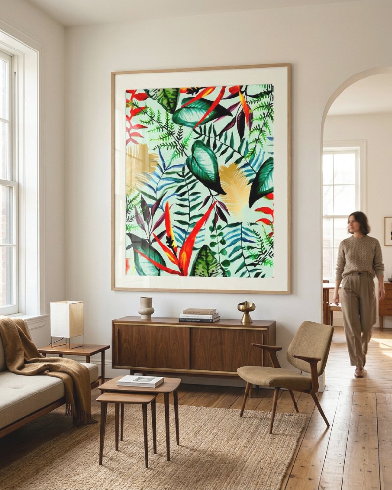 Made to live with you — not just hang on your wall. For spaces that want to feel alive, not just styled.This work is a celebration of botanical abundance, capturing the rhythmic, overlapping vitality of a tropical canopy. Paradise Dreams seeks to translate the chaotic beauty of the jungle into a balanced visual meditation on growth and vibrancy.