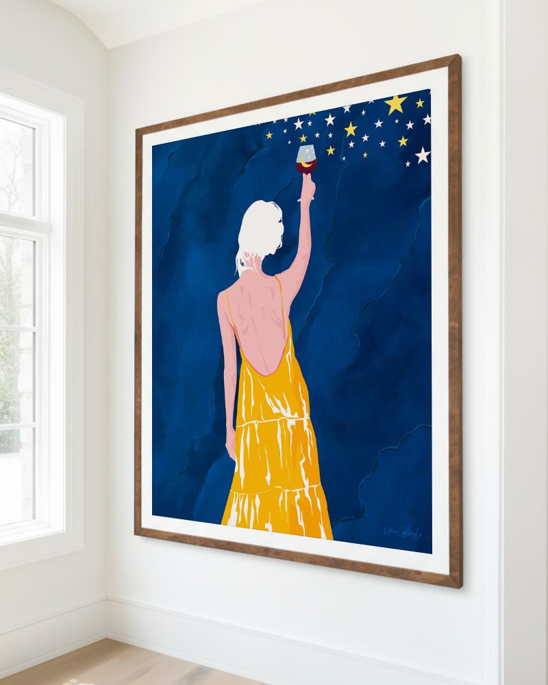 A dreamlike celebration of wonder, this piece captures a woman in a flowing yellow dress raising her glass toward the night sky, where stars and a crescent moon seem to pour directly into it. The deep indigo backdrop evokes the vastness of the universe, while the bold contrast of golden tones radiates warmth and joy. Both whimsical and empowering, the artwork is a reminder to savor life’s magic — to reach for the stars and drink in their beauty.
