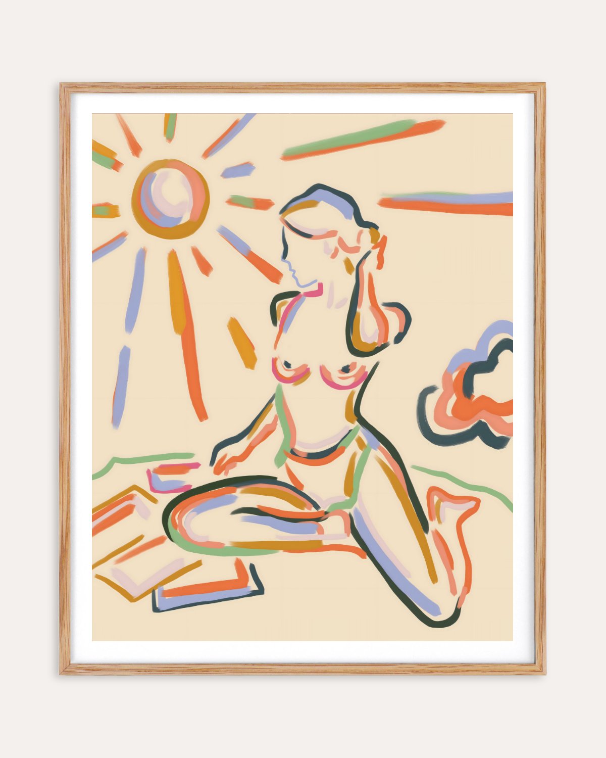 This expressive artwork celebrates freedom, warmth, and self-love through bold, fluid strokes and vibrant colors. A woman sits gracefully under the sun, her form outlined in playful, abstract lines that capture both strength and softness. With its radiant energy and minimal yet dynamic style, the piece evokes a sense of joy, confidence, and connection to the simple beauty of being present.