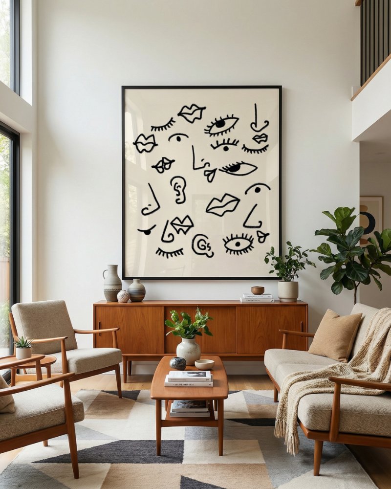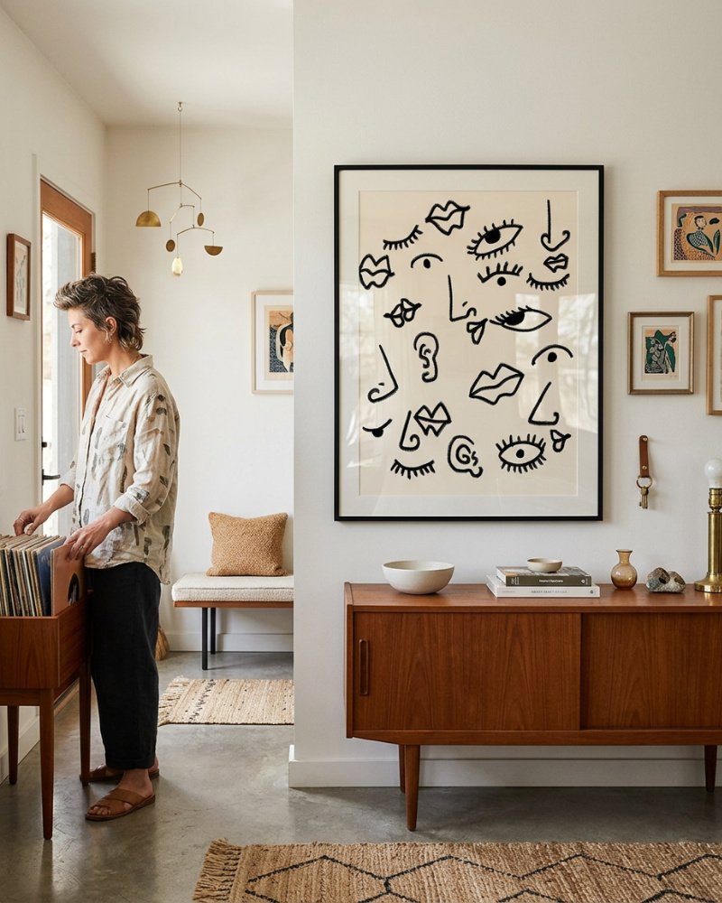 Made to live with you — not just hang on your wall. For spaces that want to feel alive, not just styled.This playful abstract brings together a collection of eyes, lips, noses, and gestures—each drawn with loose, expressive lines that celebrate individuality and perception. The artwork feels intuitive and human, inviting viewers to pause and notice the beauty in fragments, emotions, and small details we often overlook. With its neutral backdrop and bold black strokes, this piece adds character without overwhelming a space, making it perfect for modern interiors, creative studios, or anywhere you want art that feels thoughtful yet light-hearted.