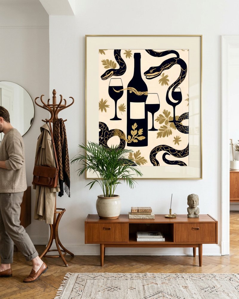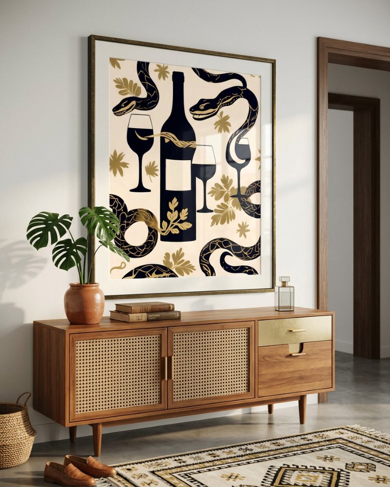 Made to live with you — not just hang on your wall. For spaces that want to feel alive, not just styled.Snakes & Wine is a modern allegory of indulgence, temptation, and quiet power. A wine bottle stands at the center like a ritual object, encircled by sinuous serpents and half-filled glasses, their forms weaving effortlessly through leaves and shadows. The contrast of deep black against warm gold gives the piece a luxurious, almost nocturnal elegance—sensual without being loud, symbolic without being literal.
