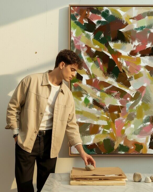 Made to live with you — not just hang on your wall. For spaces that want to feel alive, not just styled.This abstract expressionist painting is a celebration of life’s beautiful messiness. The composition is built on a foundation of intense, angular brushstrokes, where deep forest green and dark chocolate browns collide with streaks of sunny ochre and muted taupe, evoking a sense of powerful, grounded energy.