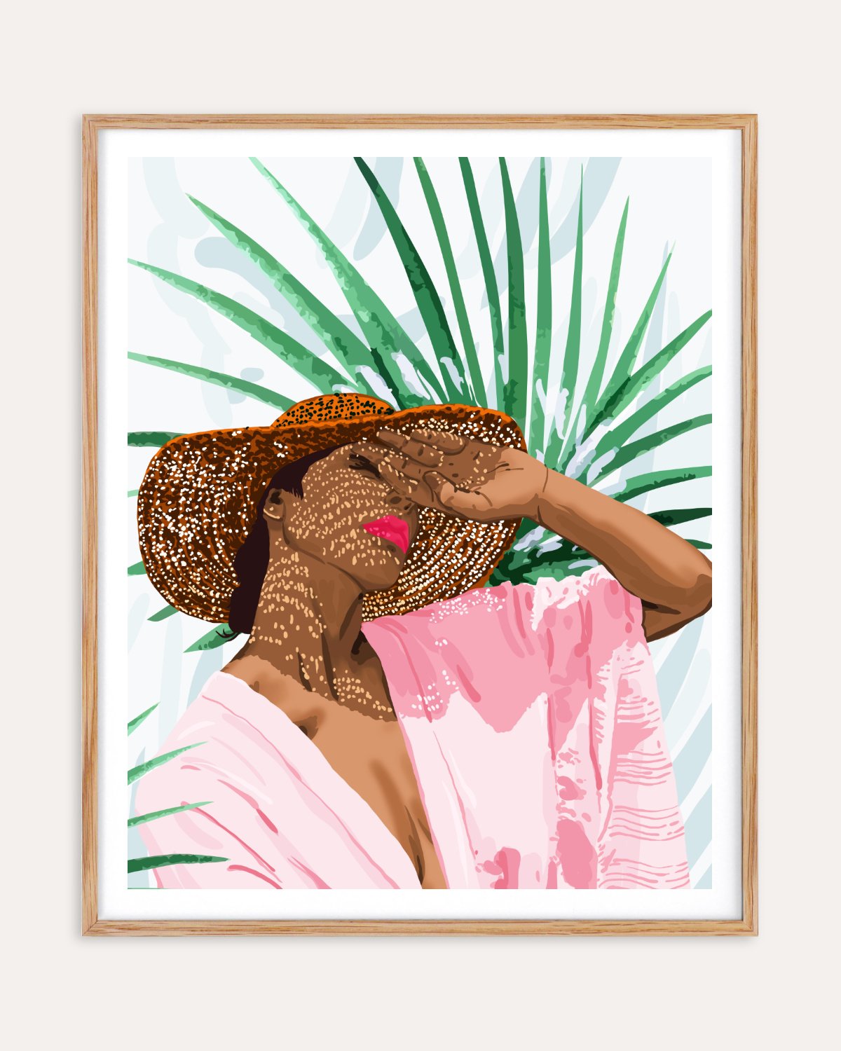 Capture the essence of a tranquil escape with this striking Sun-kissed artwork. Featuring a woman shielding her eyes from the sun beneath a wide-brimmed hat, this piece evokes a sense of serene relaxation amidst lush tropical foliage. The combination of the woman's pose, the dappled sunlight, and the vibrant palm leaves creates a captivating and immersive scene. The overall composition evokes a feeling of peace and tranquility, adding a touch of tropical elegance and sophistication.