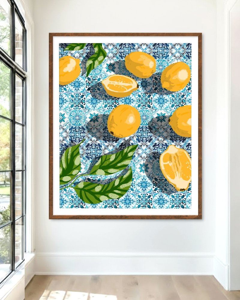 Featuring a delightful arrangement of golden lemons set against an intricate blue and white Moroccan tile-inspired background. The bold contrast of the sunny citrus and lush green leaves with the ornate patterns evokes a Mediterranean charm as it brings along a slice of sunshine, perfect for adding a touch of freshness and elegance to your home or design.