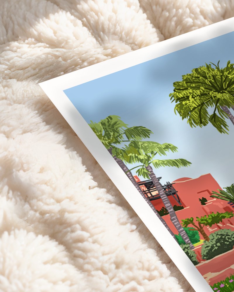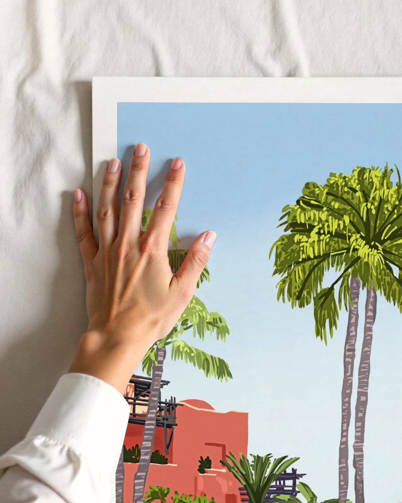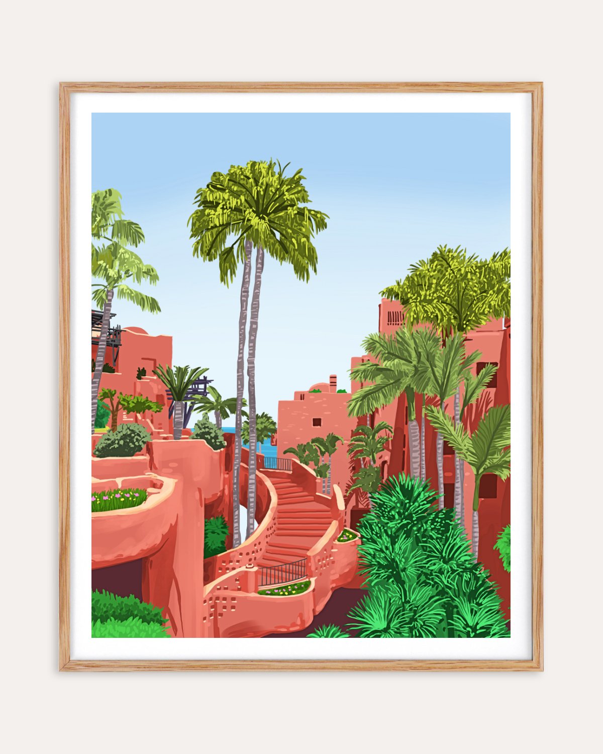 Inspired by sun-drenched architecture and lush tropical landscapes, this piece transports you to a terracotta dreamscape where winding staircases and swaying palms invite quiet exploration. The coral-hued walls echo memories of Mediterranean getaways and desert hideaways, while the path draws you forward—toward the sea, the sky, or perhaps a feeling. A celebration of place, nostalgia, and the way travel becomes part of our identity.