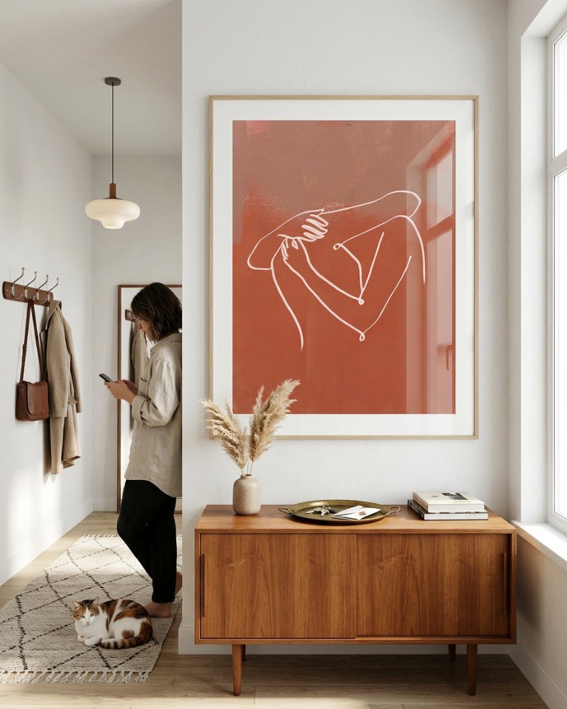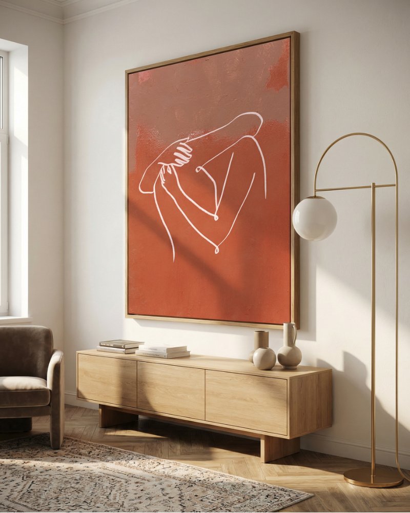 Made to live with you — not just hang on your wall. For spaces that want to feel alive, not just styled.The Embrace is a quiet study of comfort turned inward. A single, continuous line wraps gently around the figure, capturing a moment of self-holding—soft, grounded, and deeply human. Set against warm, earthy tones, the piece speaks to tenderness, resilience, and the simple act of being present with oneself.