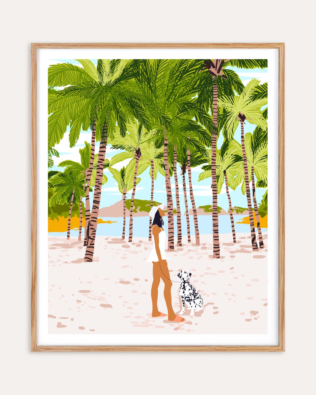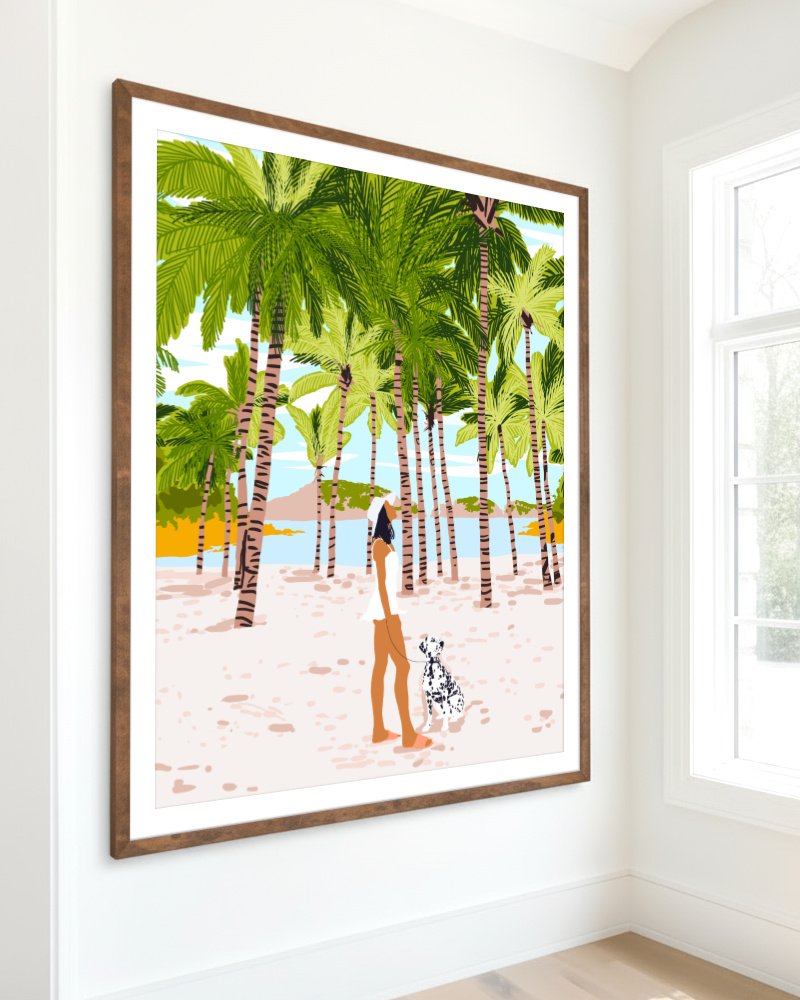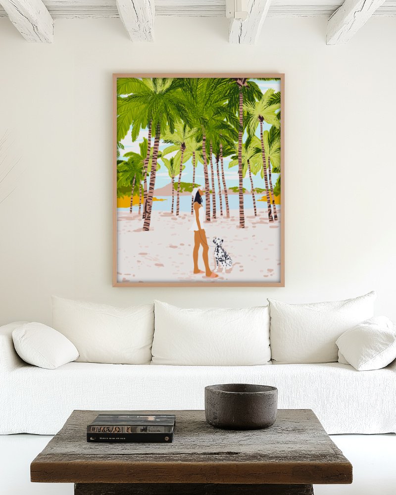 Featuring a stylish woman walking her Dalmatian dog along a sunlit beach, this piece is a celebration of leisure and tropical natural beauty. Surrounded by lush green palm trees and set against a backdrop of clear blue skies and gentle waves, the artwork captures the carefree essence of a seaside escape. Rendered in a bold, contemporary illustration style, the warm earthy tones combined with pops of greenery and light create a sense of calm and wanderlust.