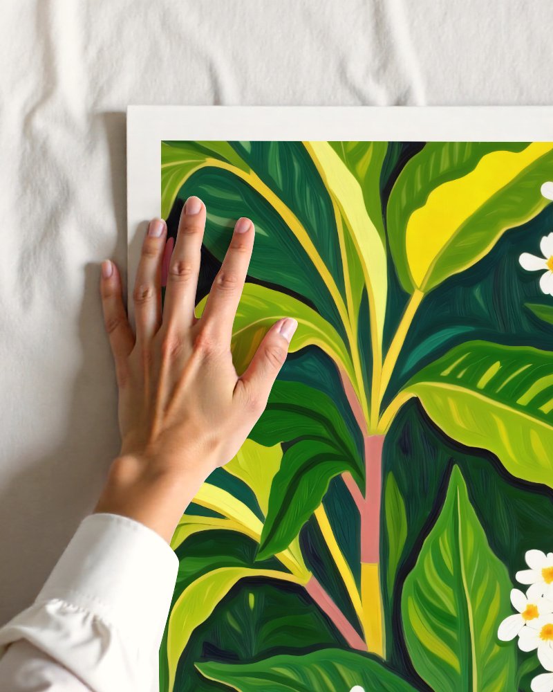 Born in the United States and spending my early childhood there, I was surrounded by a culture of individuality and self-expression. Later moving to the colorful and culturally rich landscapes of India, I absorbed its intricate patterns, vivid hues, and tropical beauty. This unique cross-cultural journey shapes my distinctive style—an uplifting fusion of bold colors, tropical motifs, and modern minimalism using a unique blend of handmade drawings & graphic art.