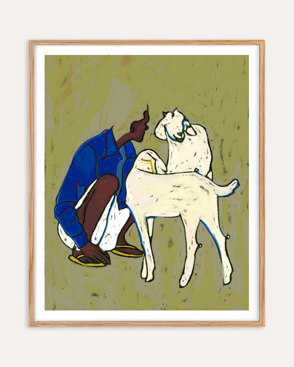 The Shepherd’s Pause captures a quiet exchange — a figure bent in rest beside a gentle animal, both held in an unspoken trust. The painterly lines and softened forms allow the scene to remain open, inviting the viewer to sense presence rather than narrative.