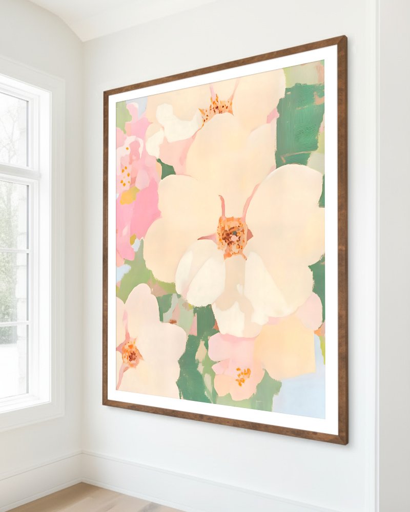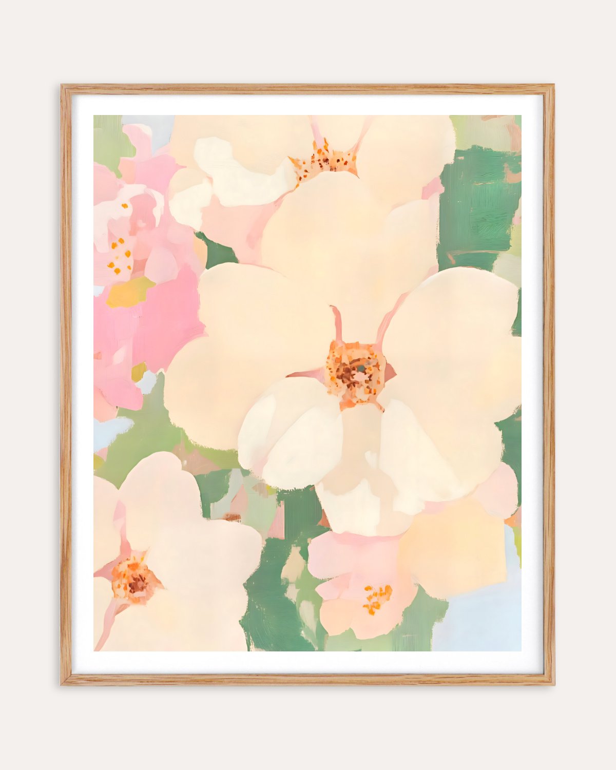Shop the softest blossom abstract pastel garden Art Print, Canvas Print - available at 83oranges.com by artist Uma Gokhale India