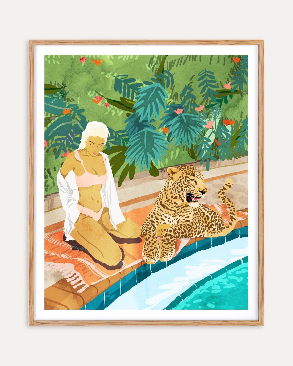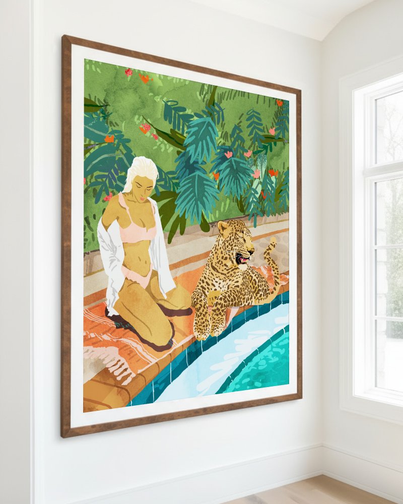Unwind in a world where elegance meets untamed spirit. The Wild Side depicts a serene moment by the pool, where a woman lounges confidently beside a majestic leopard, their calm companionship evoking an unexpected harmony between human and wild. Set against a backdrop of dense tropical foliage and warm sun-drenched tiles, this piece blurs the line between fantasy and reality—celebrating freedom, sensuality, and the fearless beauty of coexistence.