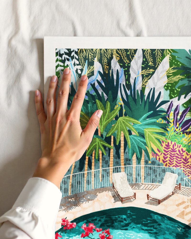 Born in the United States and spending my early childhood there, I was surrounded by a culture of individuality and self-expression. Later moving to the colorful and culturally rich landscapes of India, I absorbed its intricate patterns, vivid hues, and tropical beauty. This unique cross-cultural journey shapes my distinctive style—an uplifting fusion of bold colors, tropical motifs, and modern minimalism using a unique blend of handmade drawings & graphic art.