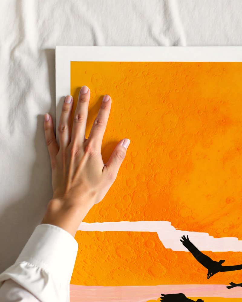 A radiant composition capturing the fleeting beauty of the moment, Time Flies features a glowing oversized sun in rich orange against soft, painterly strokes of blush and butter yellow. Silhouetted birds in motion evoke freedom, movement & the unstoppable passage of time.