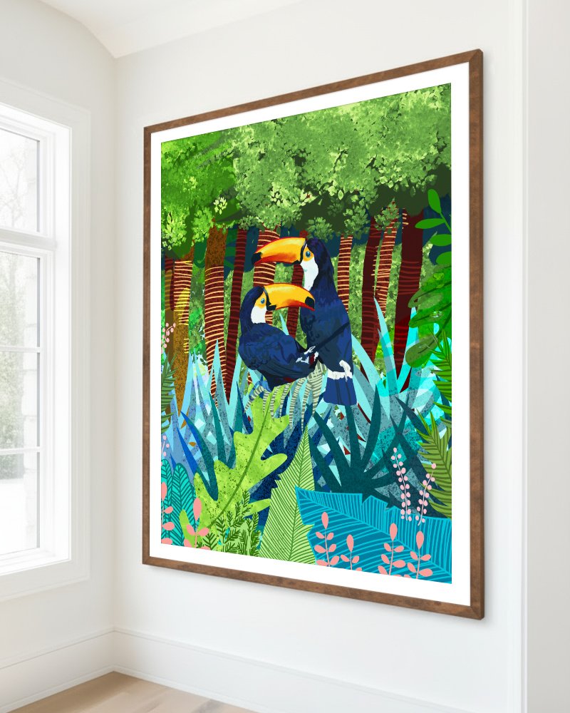 Shop Toucans jungle forest wildlife botanical nature Art Print, Canvas Print - available at 83oranges.com by artist Uma Gokhale India